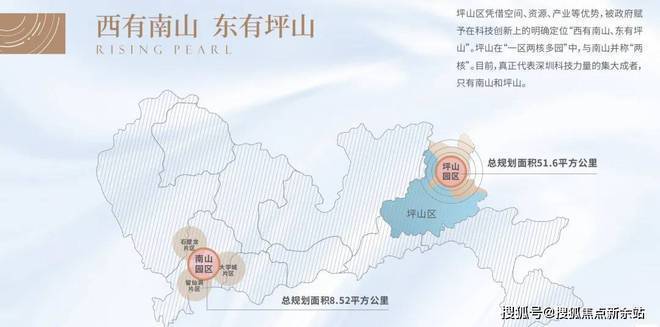 深圳以“10+1”区政策领衔湾区建设,东进战略1.4万亿投资总额,坪山区获逾6000亿元资金扶持,形成西有南山、东有坪山发展格局,坪山高新园区总面积约51.6平方公里,约为南山园区6倍,远见未来想象