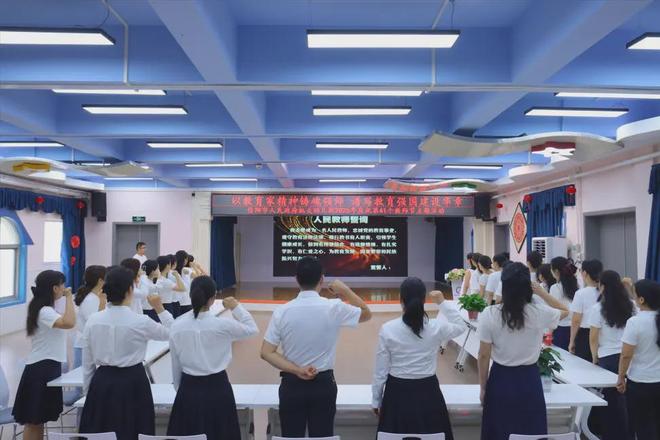 我志愿成为一名光荣的人民教师……全体教师肃立注目,右手举拳,在副园长田鹏翼的带领下庄严宣誓。铿锵有力的誓言在会场回荡,每一句承诺都是一份沉甸甸的责任,彰显着老师们践行师德、爱岗敬业、无私奉献的坚定信念。这一刻,教育家精神内化于心、外化于行,凝聚成推动学前教育高质量发展的共同意志。