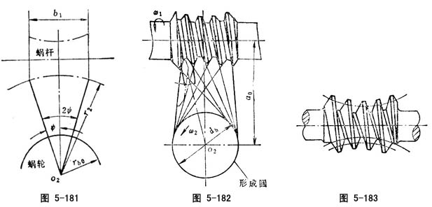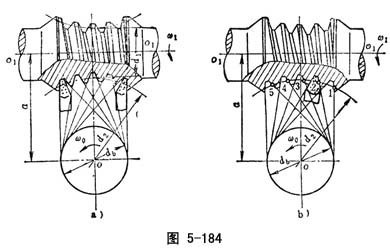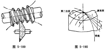 ),国内目前仅用第1种情况的锥面包络环面蜗杆。蜗杆齿面的形成过程,就是产形蜗轮(齿轮)与蜗杆按照即定传动比与中心距的啮合过程(图5-189)。
