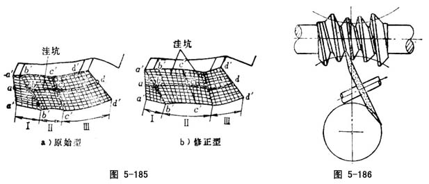 “原始型”直廓环面蜗杆配对蜗轮齿面蜗轮齿面是用“原始型”直廓环面蜗杆滚刀加工而成的,其蜗轮齿面沿齿长方向分成三个区域,Ⅱ,Ⅲ区域之间的分界线c′-c′,恰在蜗轮中间,称中间脊线),Ⅱ区是共轭区,亦即有效工作区。I,Ⅲ区为边切区。相对Ⅰ,Ⅲ区,Ⅱ区呈现凹陷状态,称“洼坑”(图5-185),“洼坑”呈现于否是影响承载能力,传动效率的关键因素。“修正型”可明显扩大Ⅱ区(图b),亦即使有效工作区增大。