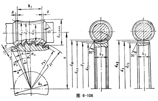 标注着环面蜗杆副各个几何尺寸和名称(多用代号表示),并明显表明它们之间相互关系的啮合图(图6-106)。