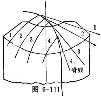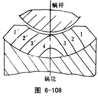 由法向直廓环面蜗杆与其直接展成的蜗轮组成的环面蜗杆副。属于车削型双包围环面蜗杆副。它具有直廓环面蜗杆副的啮合特性,同时改善了蜗杆的切削工艺。“角修正”法向直廓环面蜗杆副,消除了棱边接触,两条接触线的滑移面积都有所增大,改善了啮合特性,提高了承载能力和传动效率。见图6-110。