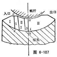 由“原始型”直廓环面蜗杆与用直接展成法加工的配对蜗轮组成的蜗杆副。通常轴交角∑=90°,属于双包围环面蜗杆副。原始型直廓环面蜗杆副的主要啮合特点是:瞬时啮合齿数多;诱导曲率半径大;接触线形状极有利于液体动压油膜的形成;蜗轮齿面上分三个区域,Ⅰ、Ⅲ区为非共轭区;Ⅱ区为共轭区,呈“洼坑”形状,在Ⅱ区内有两条瞬时接触线同时参与工作,在啮合过程中自然形成“油穴”。两条瞬时接触线中,有一条位在蜗轮轮齿中央,“洼坑”的一端(图6-107),在啮合过程中位置不变,称为“静线”(a-b线),另一条从“洼坑”另一端(c-d线)开始工作,随着工作时间的延续以很高的速度滑移,向“静线”靠拢,当与a-b线合扰的瞬间轮齿脱开工作,这条在工作中滑移的瞬时接触线)是产生动压,形成动压油膜的过程,所以该蜗杆具有良好的动压润滑状态,具有承载能力大,传动效率高的优点;“原始型”直廊环面蜗杆副,对安装精度要求极高,用飞刀加工蜗轮很难产生“洼坑”和双接触线,而滚刀工艺复杂,成本高,再加上有效共轭区面积很小,所以“原始型”直廓环面蜗杆副很难实现理想的啮合效果。目前采用的“修正型”直廓环面蜗杆副基本上克服了其不足。