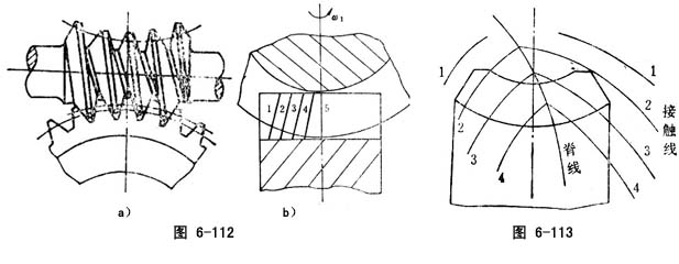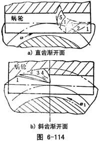 直齿(或斜齿)渐开线圆柱齿轮,与其作为产形轮展成加工出来的渐开面包络环面蜗杆组成的环面蜗杆副。通常轴交角∑=90° 。属于单包围环面蜗杆副。其啮合特性接面一次包络环面蜗杆副,但它的有效啮合区较小,蜗杆磨齿工艺较差,不适于硬齿面蜗杆,不过渐开线齿轮工艺性良好,所以尚有发展前途(图6-114)。